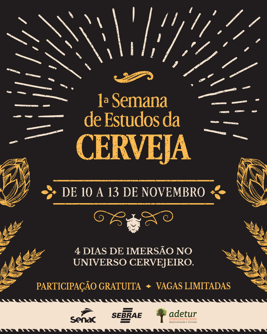 Ponta Grossa recebe, de 10 a 13 de novembro, a 1ª Semana de Estudos da Cerveja, iniciativa do Sebrae/PR e do Senac PR, com apoio da Agência de Desenvolvimento do Turismo dos Campos Gerais (Adetur), que promete unir conhecimento, negócios e cultura cervejeira. O evento gratuito reunirá empreendedores, profissionais da gastronomia e do turismo, além de estudantes e apaixonados pela bebida, em uma programação especial que antecede a tradicional München Fest. As atividades são gratuitas e com vagas limitadas.