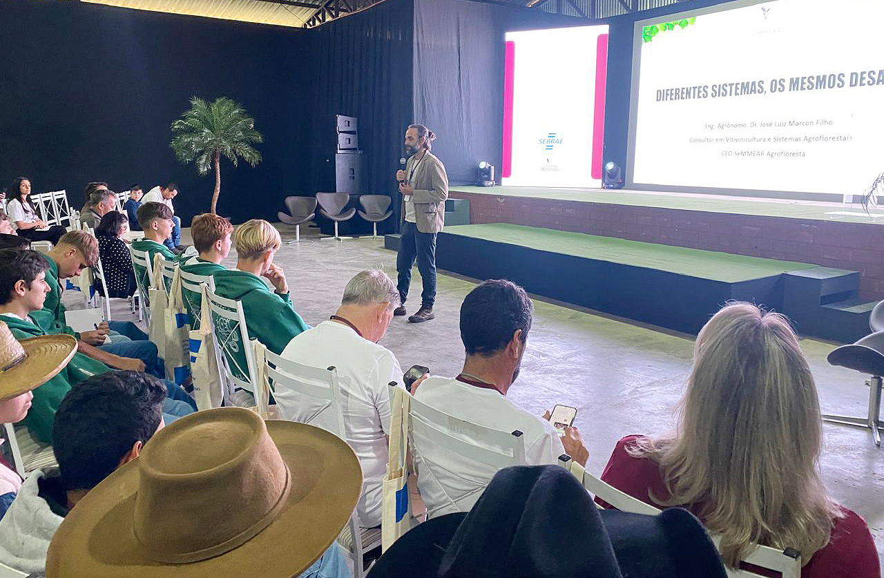 O engenheiro agrônomo José Luiz Marcon Filho conduziu a palestra “Diferentes sistemas, os mesmos desafios”, abordando a importância de repensar os modelos produtivos na vitivinicultura.
