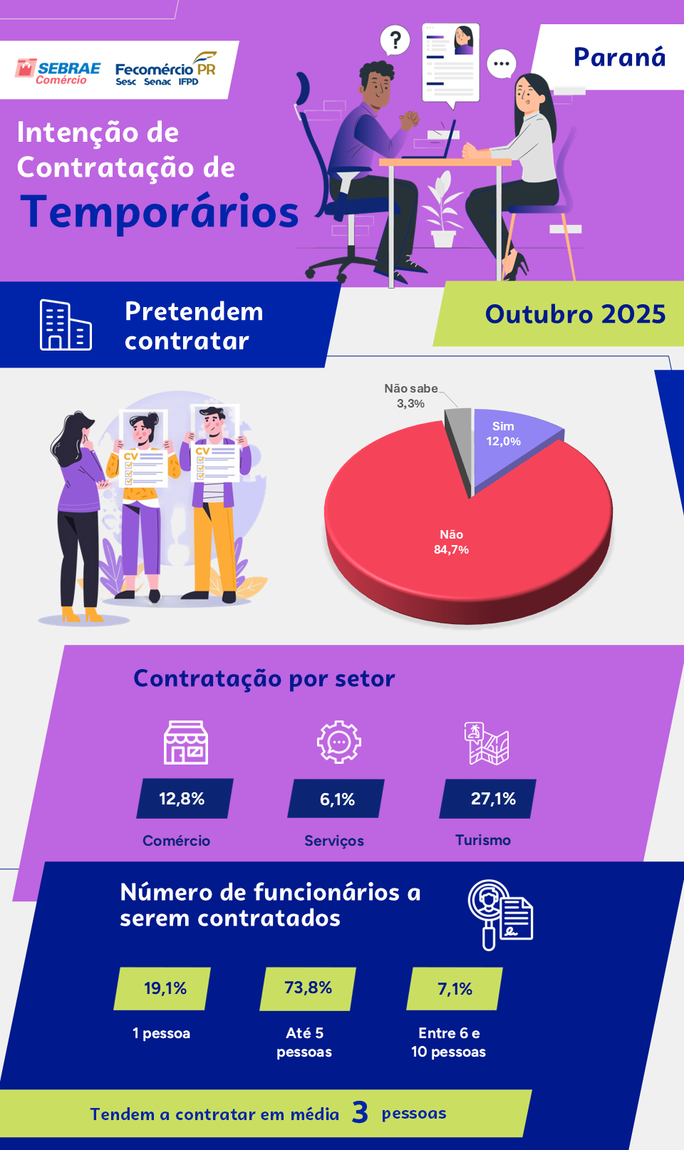 O fim de ano deve trazer novo fôlego ao mercado de trabalho paranaense, com empresas se preparando para atender ao aumento da demanda. Uma sondagem realizada pela Federação do Comércio de Bens, Serviços e Turismo do Paraná (Fecomércio PR) em parceria com o Sebrae/PR mostra que 12% dos empresários paranaenses pretendem contratar trabalhadores temporários para reforçar suas equipes durante a temporada.