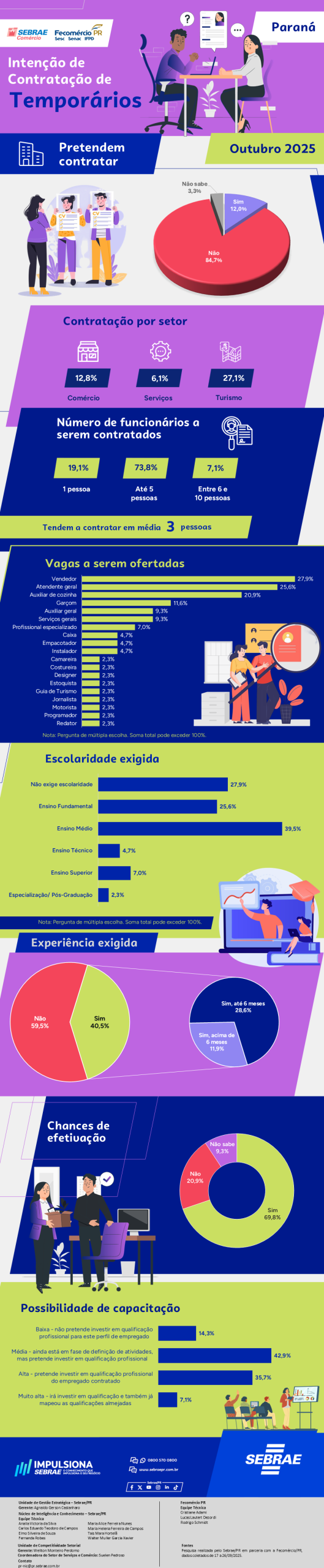 O fim de ano deve trazer novo fôlego ao mercado de trabalho paranaense, com empresas se preparando para atender ao aumento da demanda. Uma sondagem realizada pela Federação do Comércio de Bens, Serviços e Turismo do Paraná (Fecomércio PR) em parceria com o Sebrae/PR mostra que 12% dos empresários paranaenses pretendem contratar trabalhadores temporários para reforçar suas equipes durante a temporada.