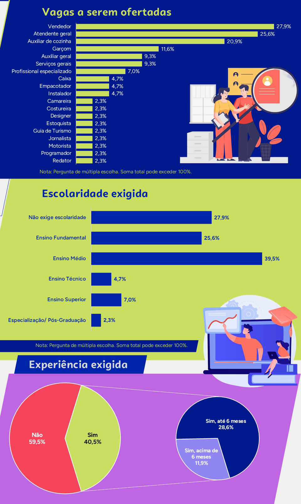 O perfil das oportunidades demonstra acessibilidade, uma vez que 39,5% das vagas exigem apenas o Ensino Médio, 27,9% não exigem escolaridade e 25,6% pedem o Ensino Fundamental. Apenas 7% demandam Ensino Superior e 4,7%, formação técnica. Outro dado relevante é que 59,5% das empresas não exigem experiência prévia, o que amplia o espaço para jovens e profissionais em busca da primeira oportunidade formal.