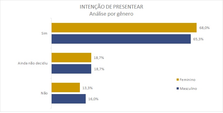 As mulheres aparecem levemente mais dispostas a comprar, com 68% de intenções positivas, enquanto entre os homens o percentual é de 65,3%.