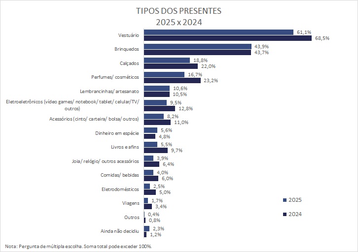 Os itens de vestuário permanecem como a escolha mais frequente dos consumidores, com 61,1% das citações, embora tenha recuado em relação aos 68,5% registrados em 2024. Os brinquedos seguem estáveis, com 43,9%, enquanto a procura por calçados caiu para 18,8%. Perfumes e cosméticos também tiveram redução, passando de 23,2% no ano passado para 16,7% em 2025. Já as lembrancinhas e o artesanato mantiveram o patamar do ano anterior (10,6%), e os eletroeletrônicos caíram de 12,8% para 9,5%.