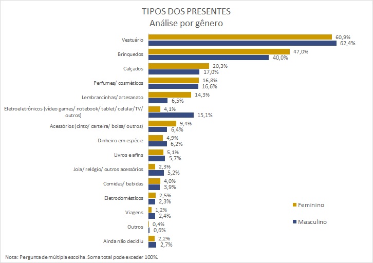 As mulheres têm maior propensão a comprar brinquedos (47% ante 40% dos homens) e lembrancinhas ou artesanato (14,3% ante 6,5%). Entre os homens, a compra de eletrônicos é mais intensa: 15,1%, contra 4,1% entre as mulheres.