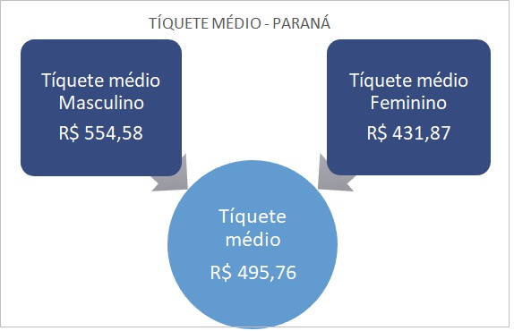 O tíquete médio caiu 3,9% este ano e ficará em R$ 495,76. Os homens devem gastar mais, com média de R$ 554,58, enquanto as mulheres pretendem desembolsar R$ 431,87.