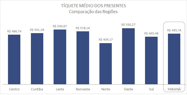 A região Oeste apresenta o maior tíquete médio, com gastos estimados em R$ 550,27 neste Natal. Também ficam acima da média estadual as regiões Leste (R$ 536,67), Noroeste (R$ 518,16) e Curitiba (R$ 501,28). Nas demais áreas, o valor previsto fica abaixo do tíquete do estado: Centro (R$ 486,74), Sul (R$ 465,48) e Norte (R$ 404,17).