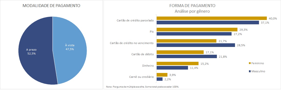 Pela natureza do valor, as compras parceladas serão maioria, representando 52,5% das operações, com destaque para o cartão de crédito parcelado. Entre os pagamentos à vista (47,5%), o Pix lidera, seguido do cartão de débito e do dinheiro.
