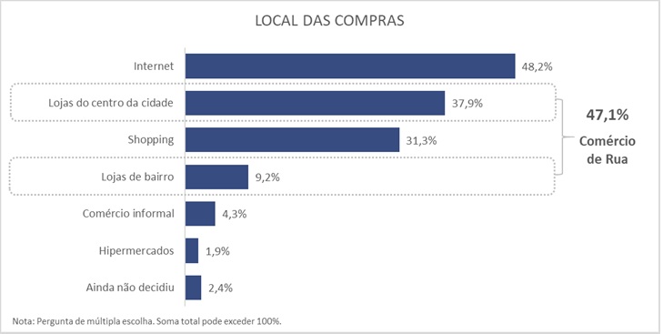 A internet será o principal canal de compra, escolhida por 48,2% dos consumidores, proporção que supera ligeiramente o comércio de rua, cuja soma entre lojas do centro e de bairro chega a 47,1%. A preferência pelo meio digital é mais acentuada entre os homens, com 51% de citações, contra 45,5% das mulheres. Já os shoppings devem concentrar cerca de 31,3% do movimento no fim de ano.