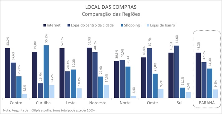Na região Central, a internet desponta como principal canal, mencionada por 53% dos entrevistados, movimento semelhante ao do Leste, com 52,8%. Em Curitiba, porém, os shoppings lideram de forma expressiva, com 55,9% das menções, superando inclusive a internet, que alcança 49%.