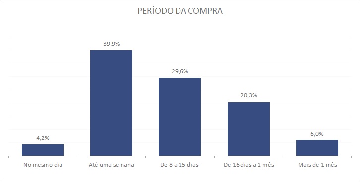 Boa parte dos entrevistados (39,9%) pretende adquirir os presentes na semana que antecede o Natal. Outros 29,6% vão às compras de 8 a 15 dias antes da data e 20,3% se programam de 16 dias a um mês antes, inclusive 14,7% dizem antecipar as compras de Natal durante a Black Friday.