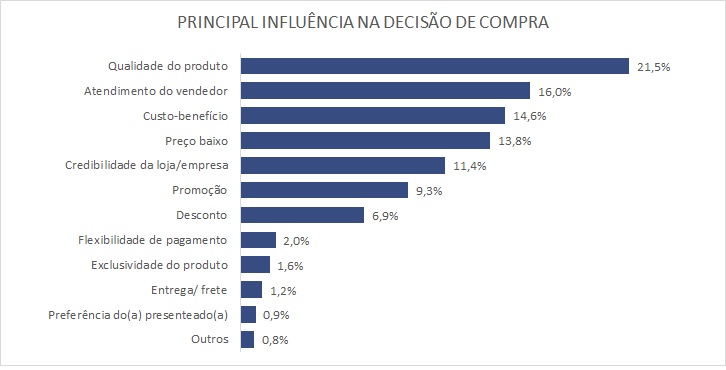 Antes de decidir, 81,7% dos entrevistados pesquisam preços, e a internet é o principal meio para isso, utilizada por 79,5% dos que comparam valores. No momento da compra, os fatores que mais influenciam são a qualidade do produto, com 21,5%, o atendimento do vendedor (16%), custo-benefício (14,6%) e preço baixo (13,8%).